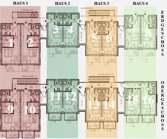Appartement 1, 2, 9 & 10 im Haus 1: Diese sind für bis zu 4 Personen ausgelegt: Die Appartements in den Häusern 2 bis 4: Geeignet für jeweils 2 bis 3 Personen.